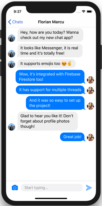 Built on Firebase Database, this iOS chat app is leveraging the security & reliability features provided by Google itself. Firestore is a cutting-edge database, which is extremely powerful, being both fast and reliable. If you play with the implementation, you’ll notice that everything is kept in sync in real-time. Your messages are being sent instantly and are stored securely. No need for your to reinvent the wheel.
