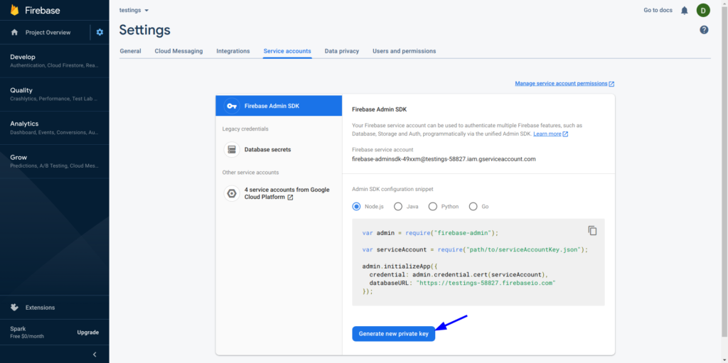 We start by going to the firebase console and to your project, then go to Project settings -> Service accounts, and now click Generate new private key. This will generate a new JSON file that contains your private key.