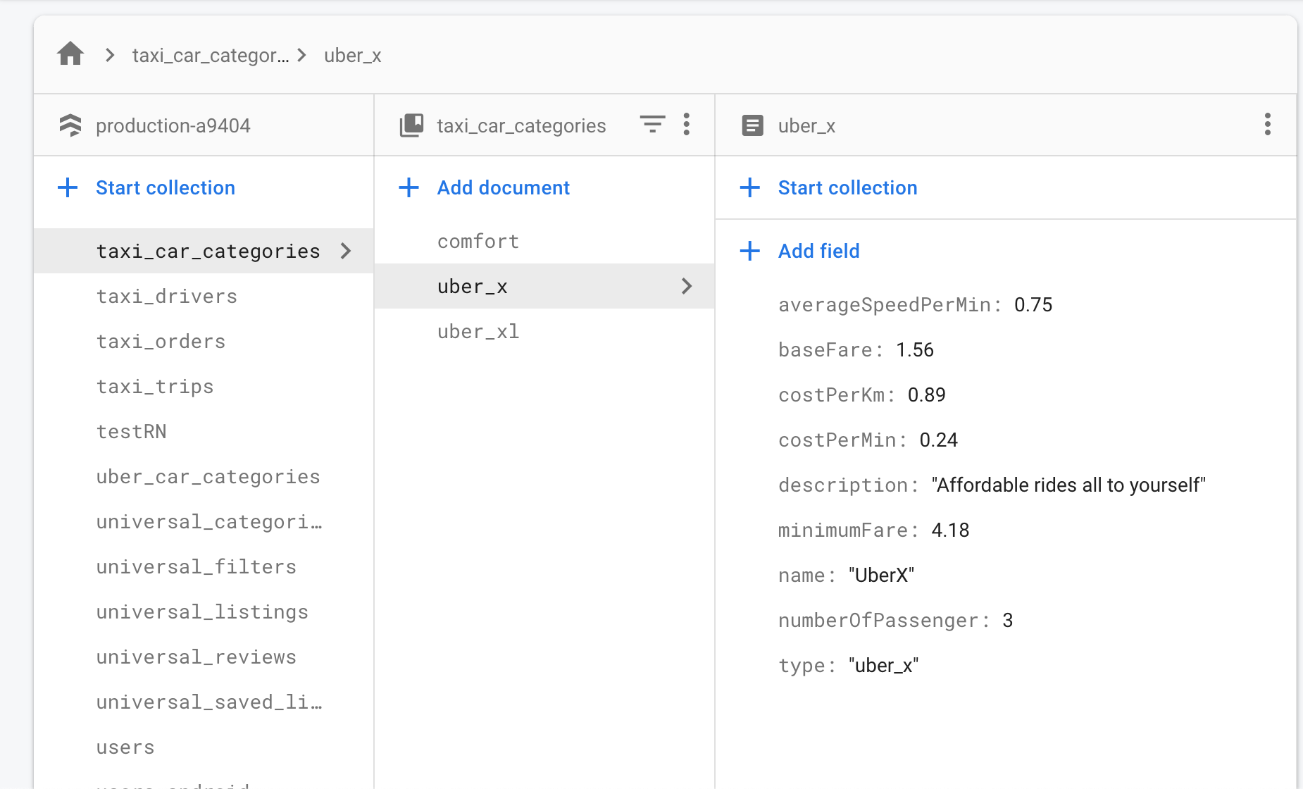 You should start by creating a collection called – taxi_car_categories The name should be exactly “”taxi_car_categories” as this is important in order not to break ur app. If you will like to use a different collection name, you should also go the source code and locate the file in the path “src/api/firebase/trips.js”, on line 4, change “taxi_car_categories” to your new collection name.