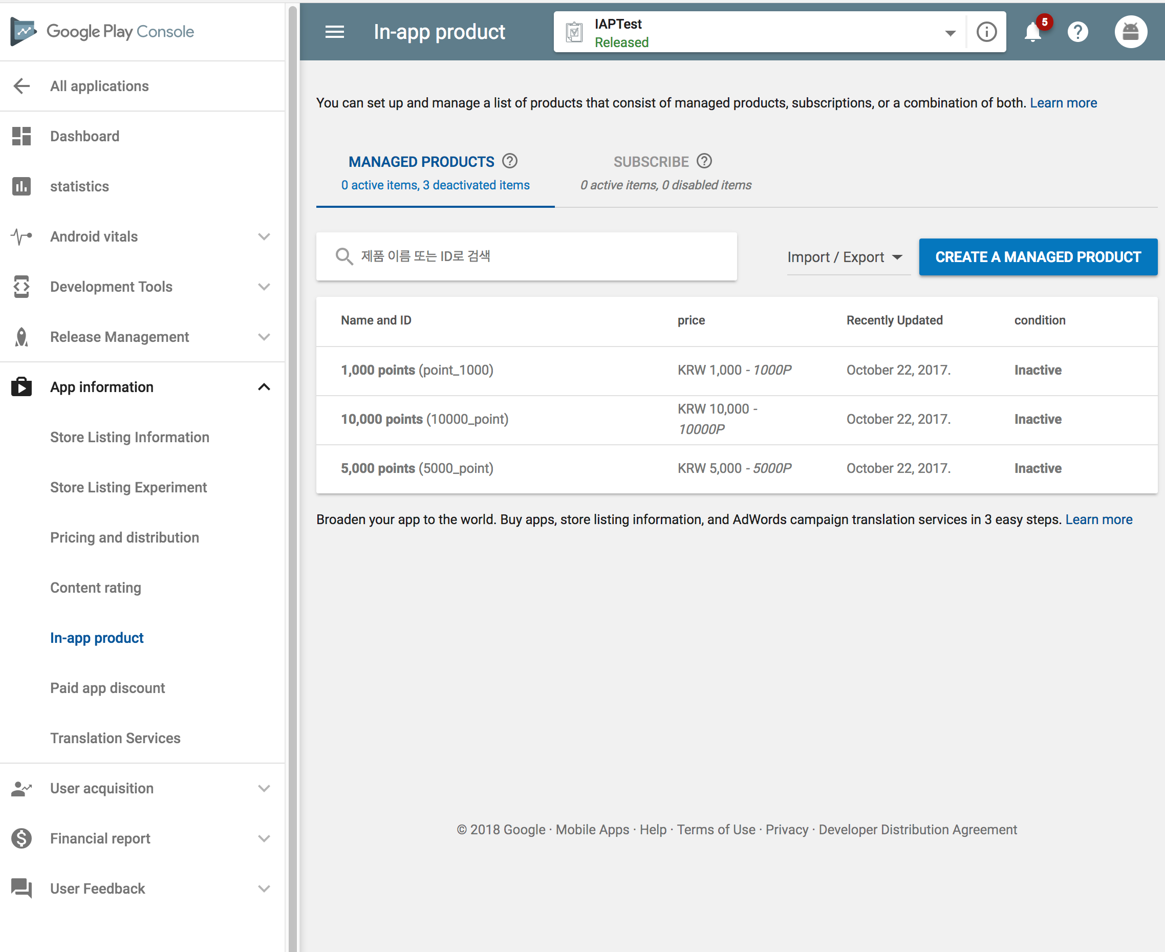 - As described in the above screenshot, you need to upload an APK and set up a merchant account before creating an In-app product.