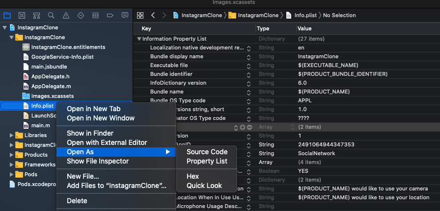- In Xcode, select the Info.plist file, right click on it -> Open As -> Source Code
