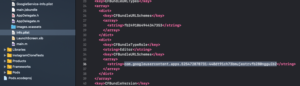 - In Info.plist source code, under CFBundleURLSchemes paste the client ID string copied at the previous step (by replacing the existing one)