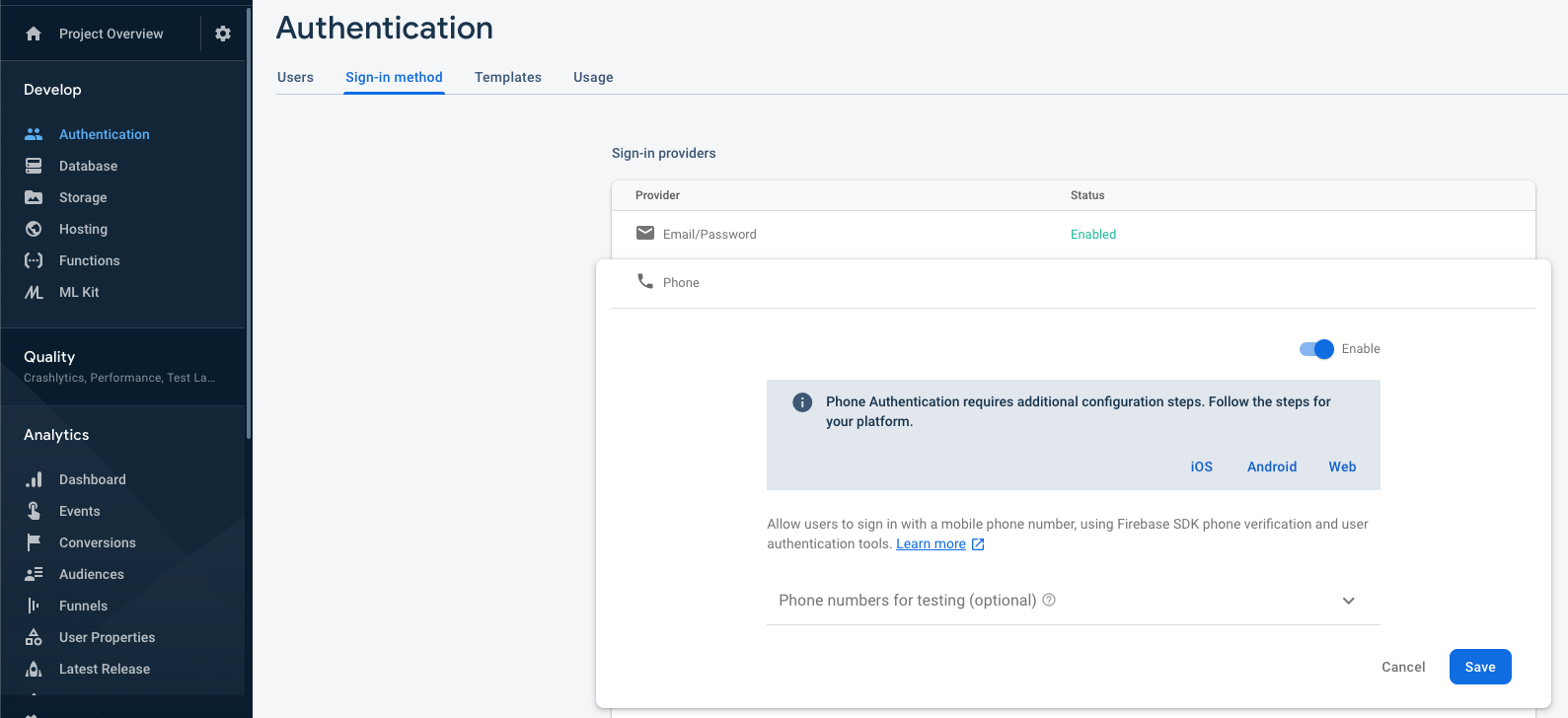 Enable Phone Authentication in Firebase