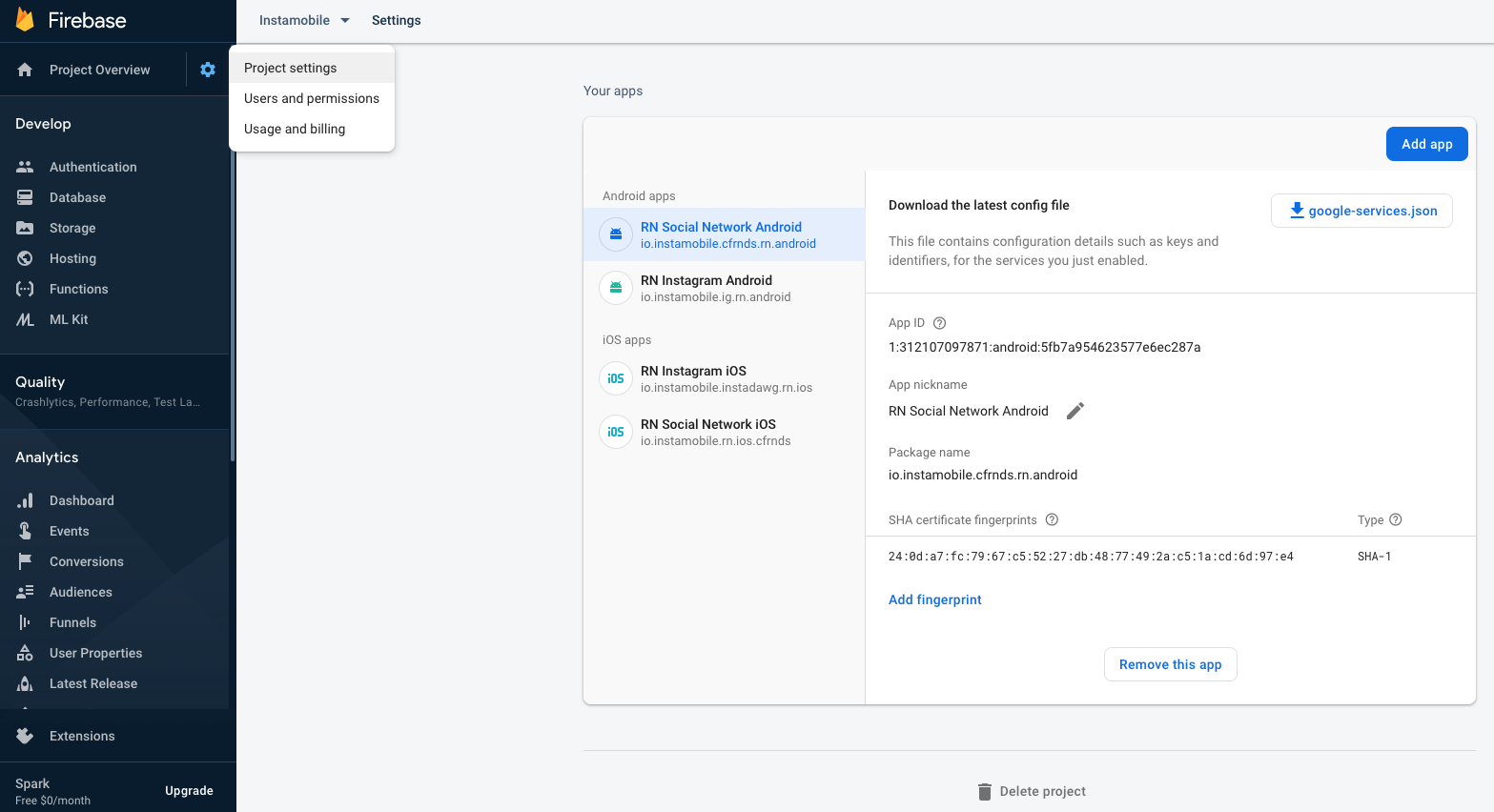 You can find more details in the official documentation from Google if you run into any issues. 3. Add the SHA-1 code to Firebase In Firebase, go to Project Settings -> Select the Android app -> Add Fingerprint and place the SHA-1 fingerprint certificate in the corresponding field: