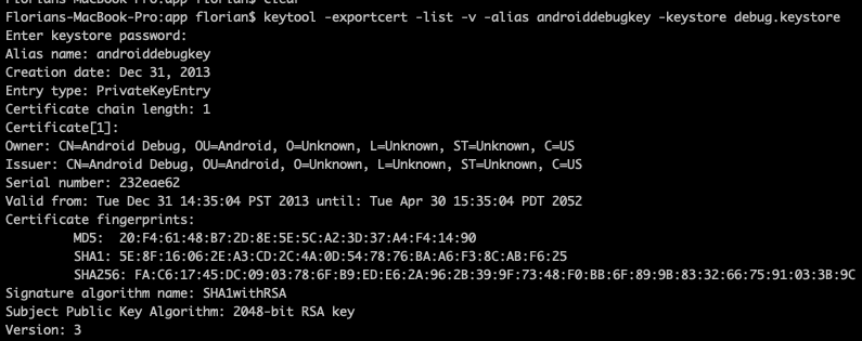 2. Generate a SHA-1 fingerprint certificate from the keystore Simply run the following command (in android/app folder). Use the password android when prompted for it.