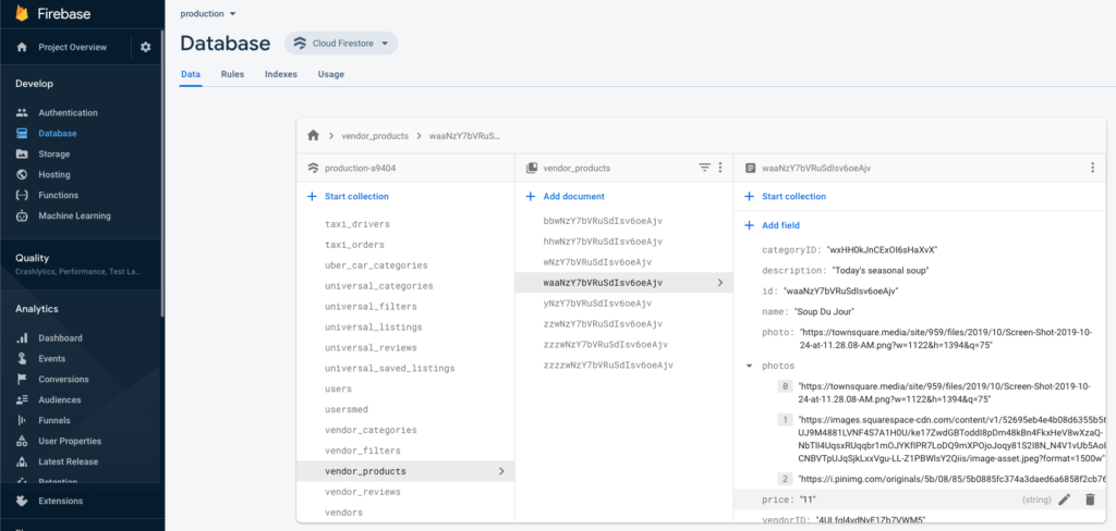 This will create a new Firestore table for each of the .json files included in the data seed. Running this script will also populate the table with all the items and their correct fields. That’s it. Now all the data is there, and your app should be usable. Re-run the React Native mobile app, and make sure that all the mock data is there. To add your own data, simply open the json files from DataSeed and modify them directly, with your own photo URLs, titles, descriptions, locations, etc. Make sure you copy the files again into the script folder, and re-run the script on all the files, every time you want to modify something. You can also directly modify this data into Firebase Console. Take a look at the Firestore structure in your Firebase Console, and make sure it looks like this:
